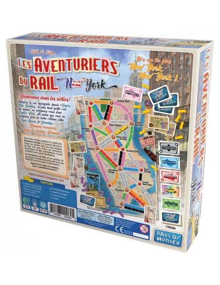 Les Aventuriers du Rail : New York est une variante plus courte des Aventuriers du Rail. Les joueurs doivent se frayer un chemin, cette fois-ci en taxi, à travers New York, afin de visiter les attractions touristiques et compléter leur cartes Destination. Avec son rythme soutenu et son format réduit, les Aventuriers du Rail : New York promet de plaire aussi bien aux débutants, qui pourront apprendre à jouer en 3 minutes, qu’aux joueurs expérimentés.