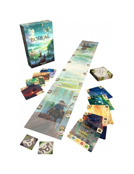 Dans Boreal vous n'avez pas de cartes en main, celles-ci sont partagées entre vous et votre adversaire sur un plateau au centre de la table. Il va falloir gérer au mieux le déplacement de votre pion sous ce plateau, car c'est lui qui indique à la fois combien de ressources vous avez et à quelles cartes vous avez accès. A chaque carte récupérée vous devrez aussi réfléchir où la positionner dans votre pyramide pour maximiser vos ressources mais également vos points de victoire. Enfin, le rythme de la partie sera également très important. Attention à ne pas trop vous faire devancer car la partie s'arrête quand une des deux pyramides est complète.