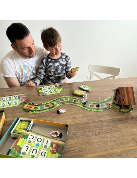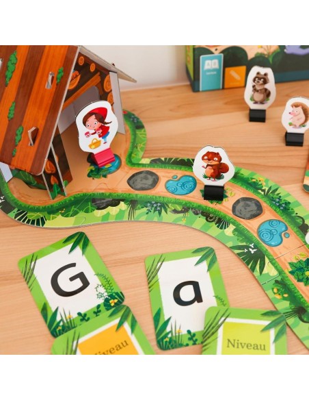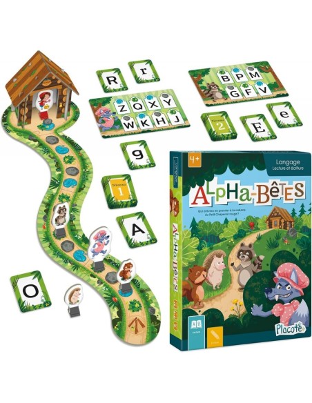 - CONTENU DU JEU – 1 plateau de jeu avec une cabane en 3D, 144 cartes-lettres (2 niveaux), 4 fiches-personnages, 5 pions, 1 guide d’accompagnement, les règles du jeu. Pour 2 à 4 joueurs, 10 minutes et plus.