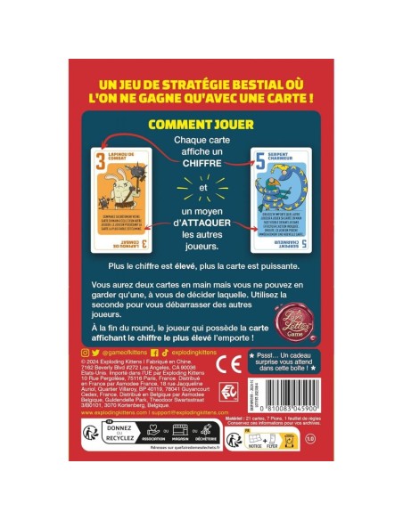 Découvrez Power Hungry Pets, un jeu de cartes passionnant qui réinvente les classiques d'Exploding Kittens et Love Letter pour créer une aventure stratégique et pleine de rebondissements. Ce jeu astucieux et retors offre des heures de divertissement avec des règles simples mais une profondeur stratégique impressionnante. Le principe de Power Hungry Pets est aussi facile à comprendre qu’il est difficile à maîtriser. Chaque joueur commence avec une carte en main. À chaque tour, vous piochez une nouvelle carte et devez choisir laquelle garder et laquelle jouer. La carte jouée active un effet unique, souvent destiné à mettre des bâtons dans les roues de vos adversaires. Vous pourriez forcer un joueur à révéler sa carte, échanger votre main avec la leur, ou encore les éliminer de la manche. La variété des effets rend chaque partie unique et imprévisible. Le cœur du jeu réside dans la valeur des cartes. Plus la valeur est élevée, plus l'effet de la carte est puissant et souvent vicieux. Cette mécanique pousse les joueurs à faire des choix stratégiques à chaque tour : conserver une carte puissante pour la victoire finale ou l’utiliser pour ses effets dévastateurs. À la fin de chaque round, le joueur avec la carte de la valeur la plus élevée l’emporte, ce qui fait de chaque décision un pas vers la victoire ou la défaite. Power Hungry Pets est idéal pour les soirées entre amis ou en famille. La simplicité des règles permet une prise en main rapide, mais la richesse des stratégies possibles garantit des parties intenses et renouvelées. Le jeu favorise l’interaction entre les joueurs, les rires et les rebondissements, tout en demandant une réflexion tactique constante. Ce jeu de cartes est un excellent ajout à toute collection de jeux de société, offrant une combinaison parfaite de stratégie et de fun. Que vous soyez un amateur de jeux de société ou un joueur occasionnel, Power Hungry Pets saura vous captiver et vous divertir. Il constitue également une idée cadeau parfaite pour tous les âges, apportant des heures de plaisir et de compétition amicale. Alors, préparez-vous à piocher, choisir et jouer la meilleure carte pour éliminer vos adversaires et remporter la victoire dans Power Hungry Pets !