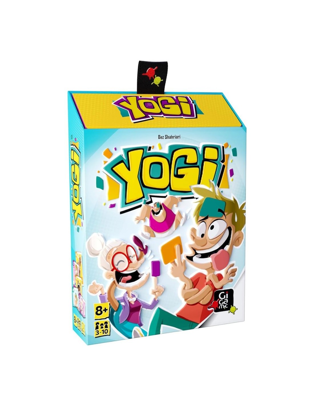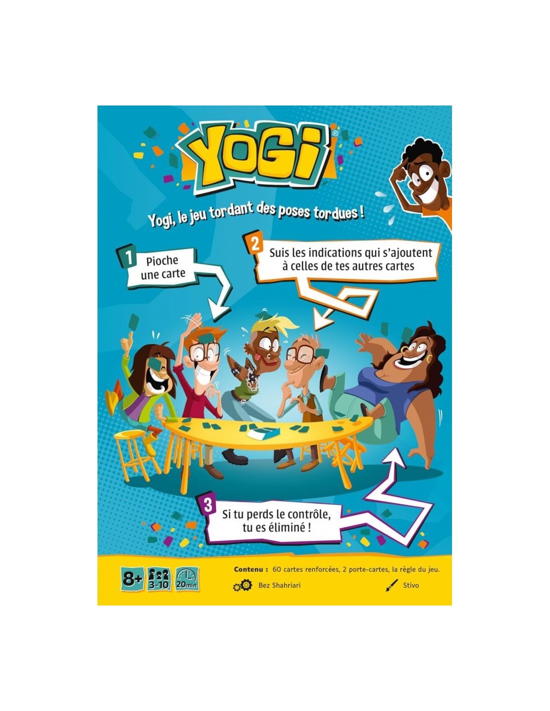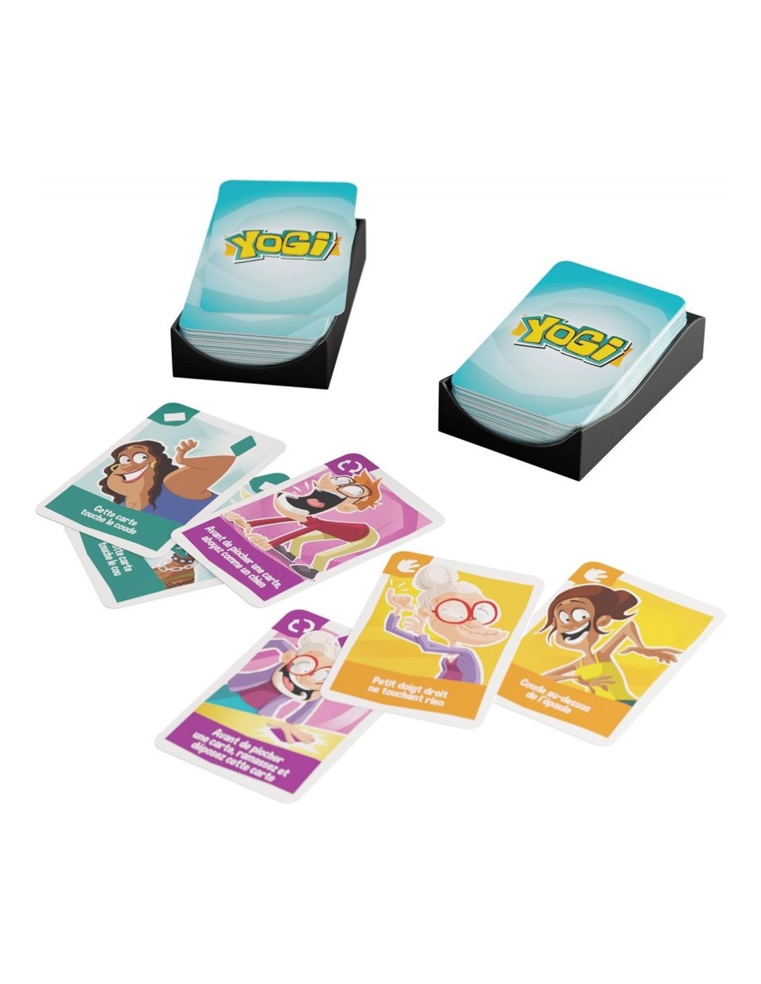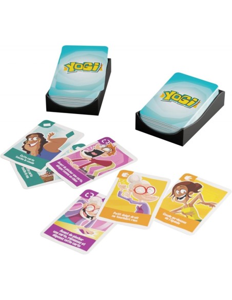 Yogi est un jeu d’ambiance impliquant des défis physiques. A leur tour, les joueurs piochent une carte et doivent suivre le défi imposé. Par exemple «un doigt touche le nez», «le coude gauche au-dessus de l’épaule», « Les deux mains doivent se toucher» ou «cette carte sur votre tête». L’instruction sur la carte doit être suivie pour tout le reste du jeu. Mais les cartes s’accumulent et un joueur qui n’arrive plus à respecter tous ses défis est éliminé. Qui sera le dernier en jeu? Yogi inclut des variantes d’équipe, ainsi qu’une variante sadique où les joueurs imposent des défis à leurs adversaires.L’essayer c’est adopter !