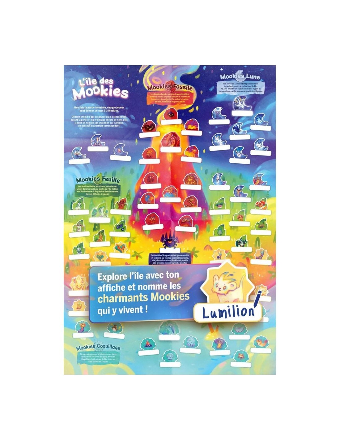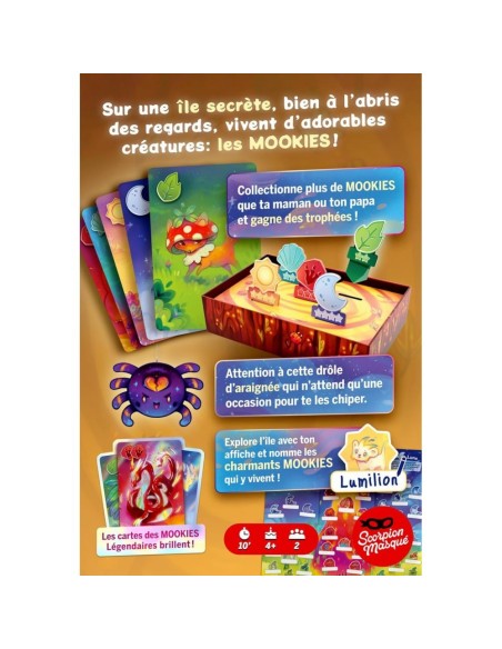 Explorez l'île secrète des Mookies ! Ce jeu d'observation et de collection pour 2 joueurs dès 4 ans vous plonge dans un univers peuplé de créatures adorables. Collectionnez les Mookies, remportez des trophées et méfiez-vous de l'araignée malicieuse ! Avec des règles simples et un matériel coloré, L'île des Mookies est idéal pour initier les enfants aux jeux de stratégie tout en partageant un moment complice en famille.