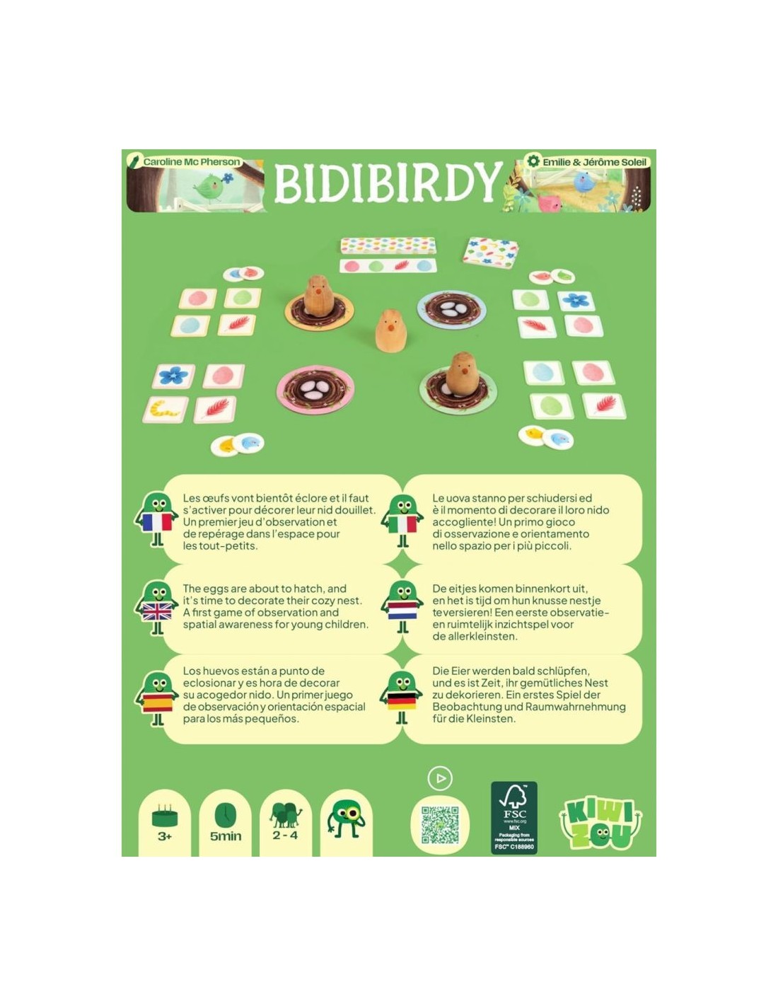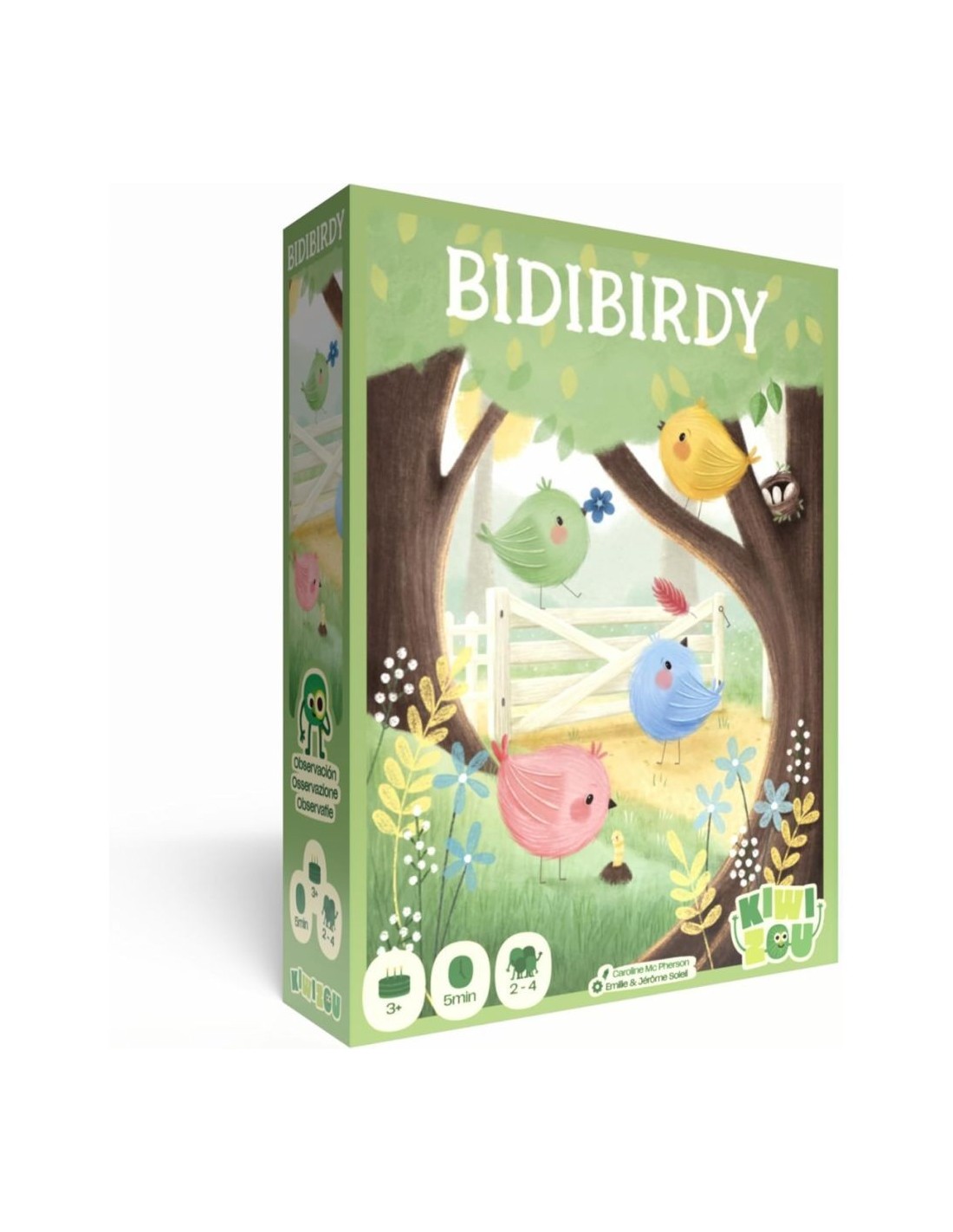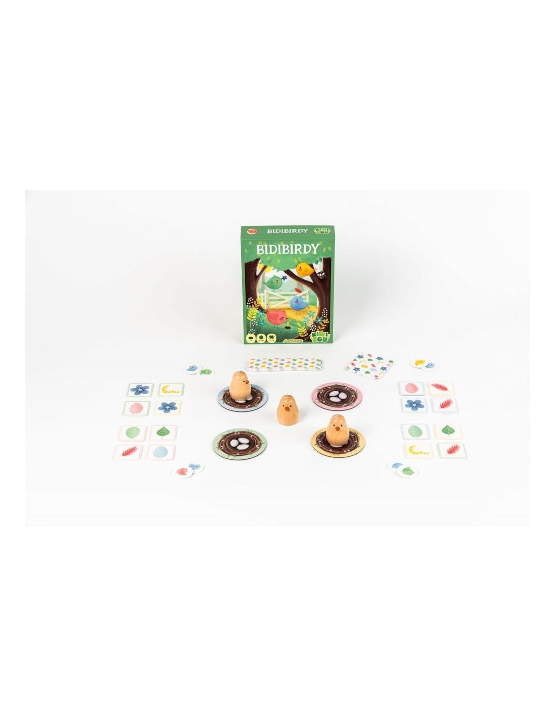 La carte défi indique 4 éléments de décors : les joueurs doivent retrouver parmi leur tuiles recto-verso les 4 éléments identiques. Dès que c'est trouver il faut attraper une oiseau du centre de la table. Un premier jeu d'observation et d'association, adapté pour les tout-petits et rehaussé par des illustrations d'une infinie tendresse.