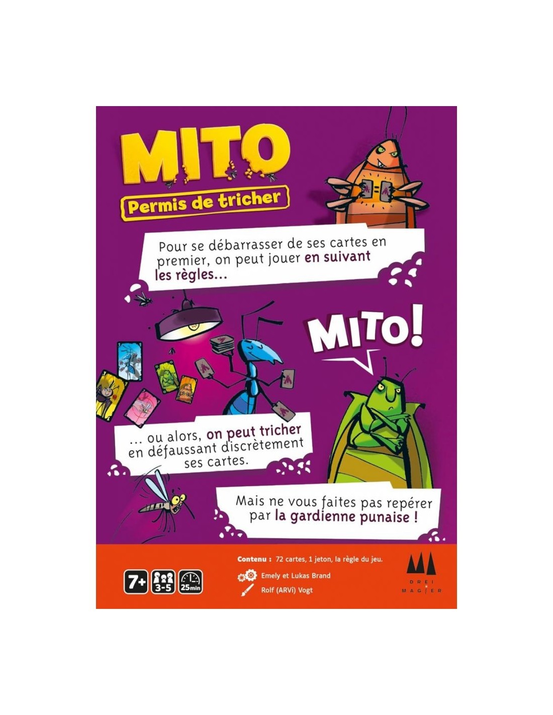 Pour se débarrasser au plus vite de ses cartes, tous les moyens sont bons, même… la triche. Chacun son tour prend le rôle de la Punaise qui veille au grain en surveillant les autres. Serez-vous honnête en respectant les règles ou … allez-vous tricher ? Mettre une carte dans sa manche, en faire tomber sur ses genoux, … à condition de ne pas se faire prendre, tout est possible! Attention toutefois à rester attentif au jeu, car des cartes spéciales viennent régulièrement bousculer la partie. Mito est un jeu « mitique » et complètement dinguo.